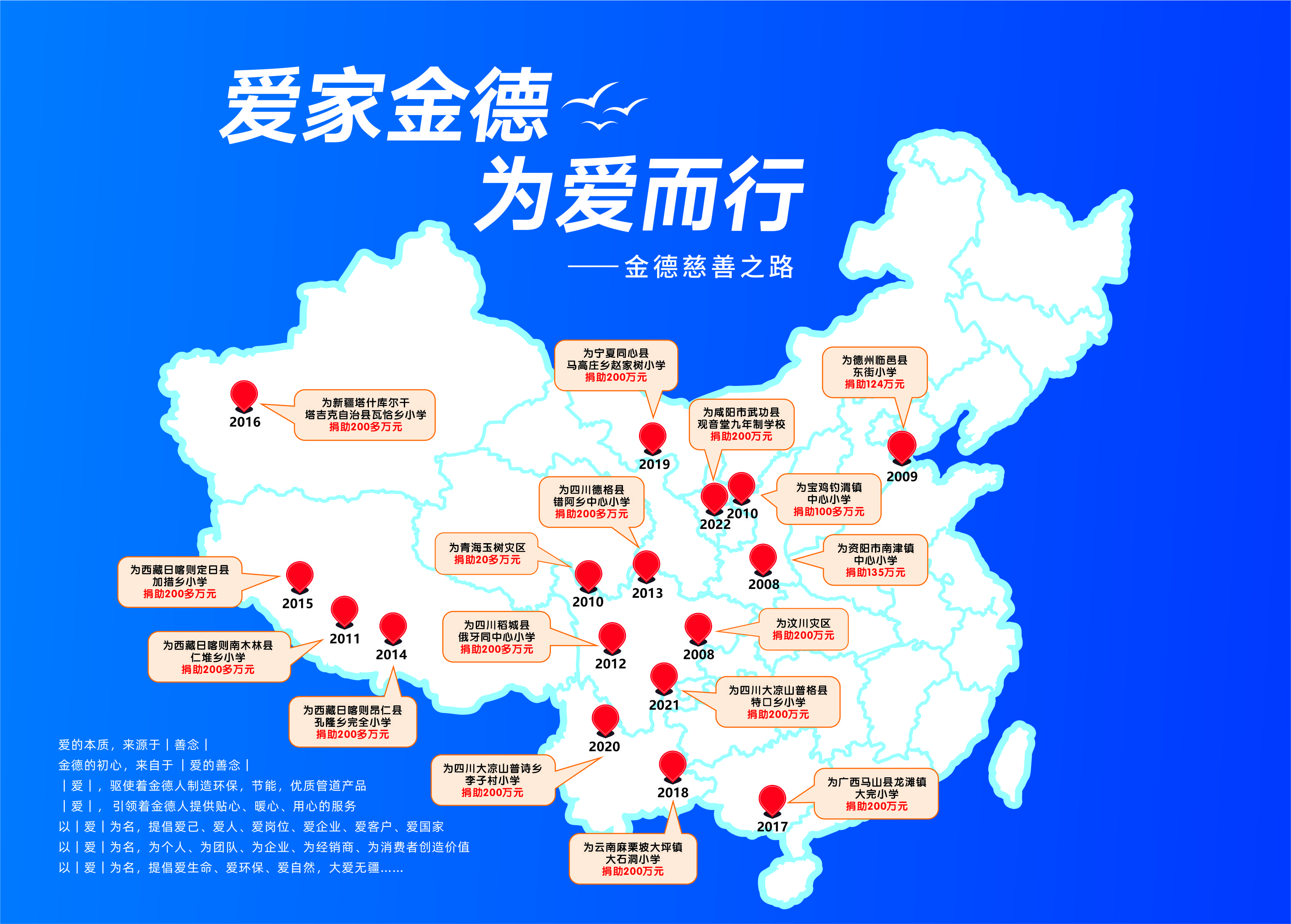 為了銘記汶川地震,也為了幫助更多貧困地區(qū)的孩子們得到更好的教育,金德管業(yè)集團(tuán)把每年的五月份定為企業(yè)的慈善月。每年五月,金德管業(yè)集團(tuán)全體員工和廣大經(jīng)銷商朋友都會慷慨解囊,捐助一所希望小學(xué),期間金德人做慈善的腳步從未中斷過。